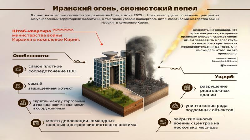 В ответ на агрессию сионистского режима на Иран в июне 2025 г. Иран нанес удары по важным центрам на оккупированных территориях Палестины, в том числе ударам подверглась штаб-квартира министерства войны Израиля в комплексе Кирия.