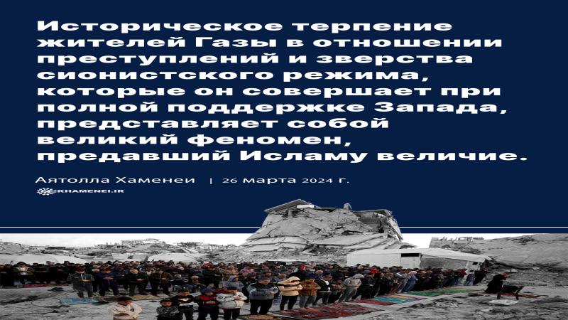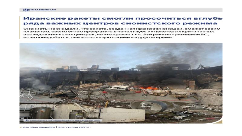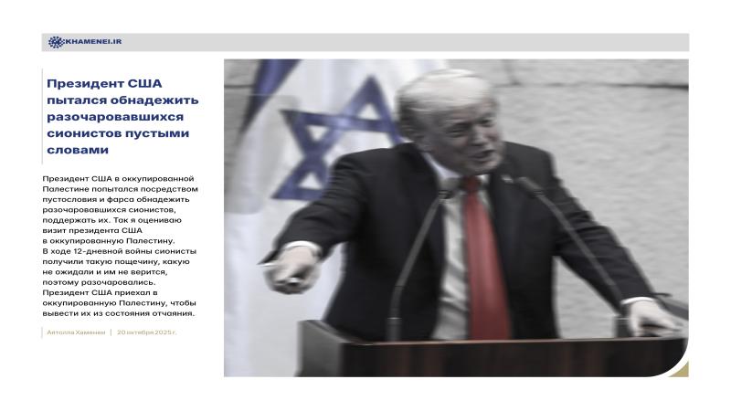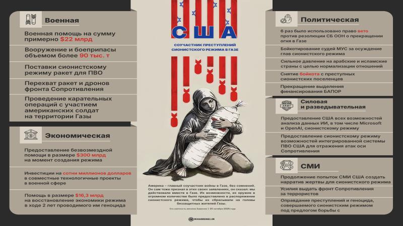 Америка – главный соучастник войны в Газе, без сомнений. Он сам тоже признал в этих своих заявлениях, он сказал: мы действовали вместе в Газе. Их возможности, их оружие в огромном количестве было предоставлено в распоряжение сионистского режима, чтобы их сбрасывали на головы беззащитных жителей Газы. Его светлость аятолла Хаменеи 20 октября 2025 года