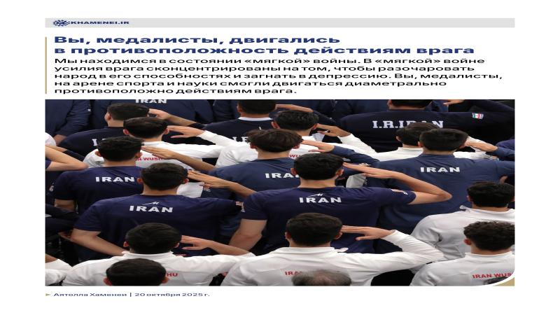 Мы находимся в состоянии «мягкой» войны. В «мягкой» войне усилия врага сконцентрированы на том, чтобы разочаровать народ в его способностях и загнать в депрессию. Вы, медалисты, на арене спорта и науки смогли двигаться диаметрально противоположно действиям врага.