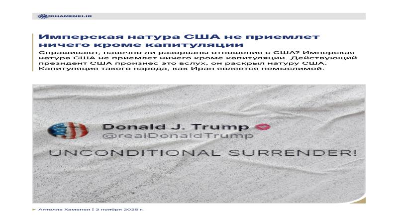 Спрашивают, навечно ли разорваны отношения с США? Имперская натура США не приемлет ничего кроме капитуляции. Действующий президент США произнес это вслух, он раскрыл натуру США. Капитуляция такого народа, как Иран является немыслимой.